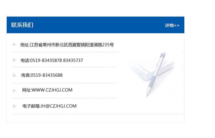傳真:0519-83435688    郵編:213135    網址:WWW.czjhgj_com.hddgsb.com    電子郵箱:JH@czjhgj_com.hddgsb.com